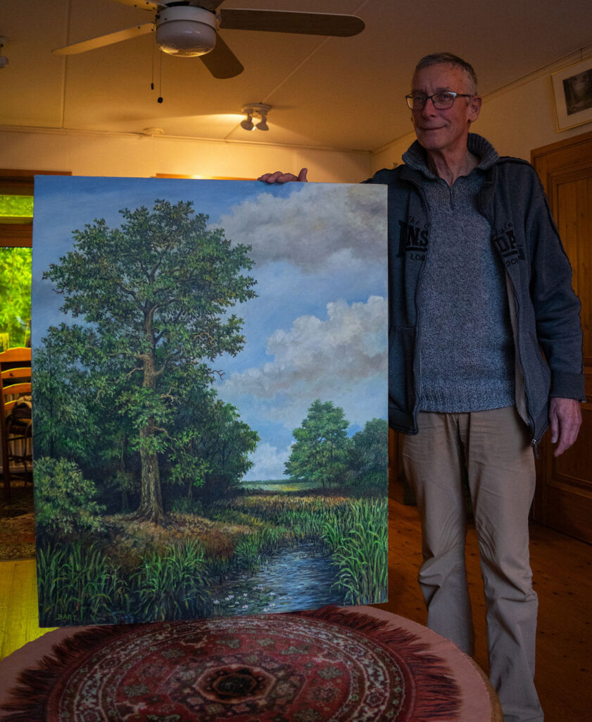 Om en nabij acht tot negen jaar later, eind 2022 hebben we de expositie met het werk van Bart opgezet en krijgen we een email van Frank Franken. Frank is een jeugdvriend van Bart en hij heeft de expositie bezocht en wenst een printje te bestellen van het een van de pasteltekeningen van Bart. Netty, mijn moeder, ging bij hem langs om het printje te bezorgen en realiseerde zich dat Frank ook een bekwaam olieverfschilder is met landschappen. Ze komt op het idee hem te vragen het beschadigde schilderij te restaureren. Ik ben blij hiermee akkoord te gaan want het schilderwerk van Frank is heel mooi en het feit dat Bart en Frank vrienden waren maakt dit tot een heel bijzondere samenwerking.
